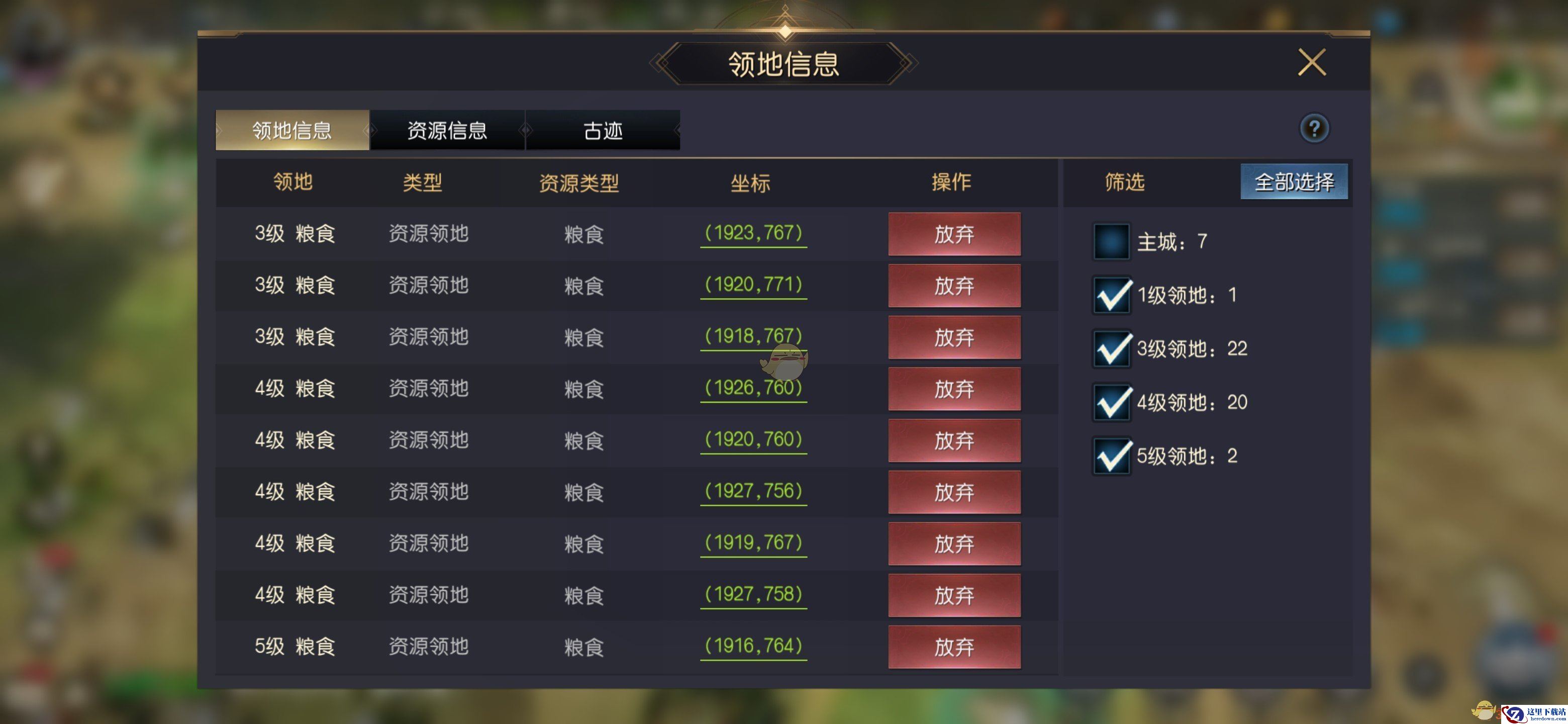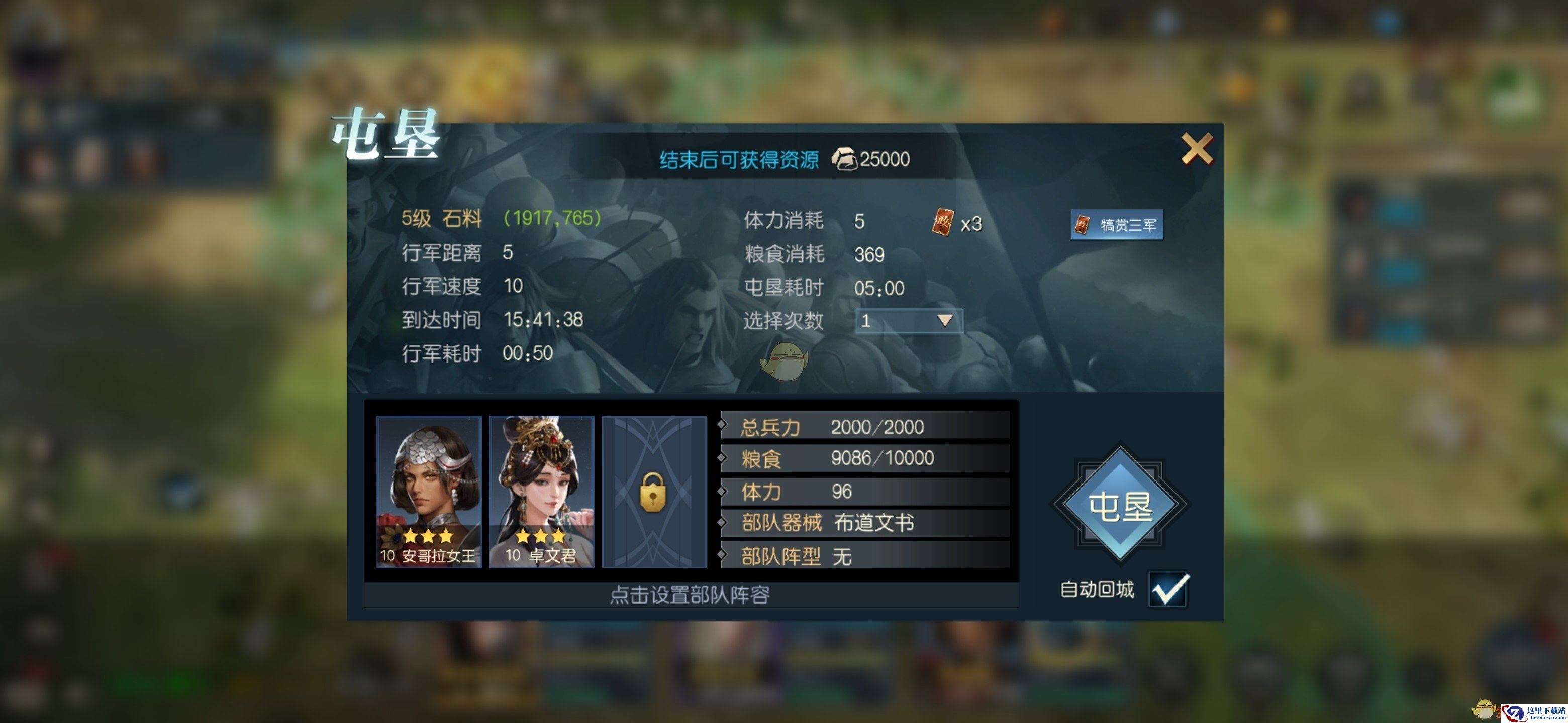 如果石料紧缺,就派出打杂队前往目前最高级的石料地块进行屯耕。5级地块一次屯耕可以换取25000的资源,所以第一个5级地块务必打石料地。