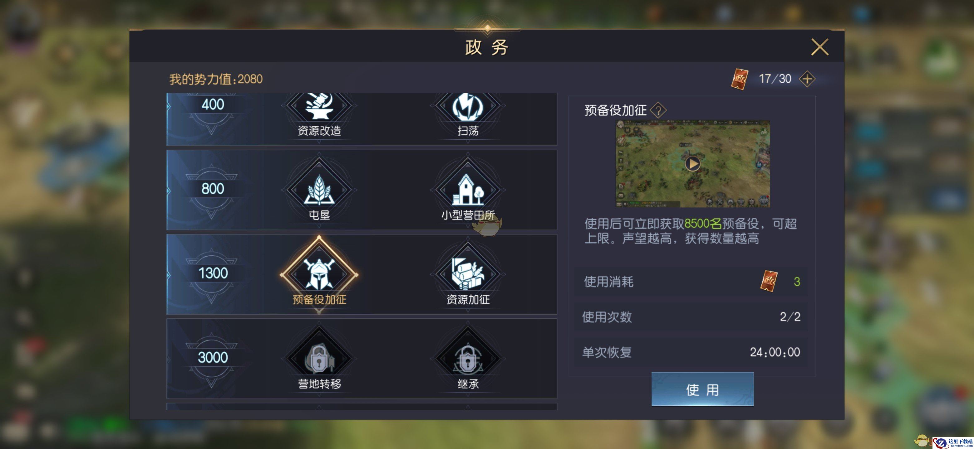 前期,玩家的部队会大量升级,很快就会遇到预备兵不足,无法满编的情况。此时不要花费任何资源进行征兵,而是直接使用预备役加征功能,一次补齐你的部队。按照图里的转换比来算,3点政令就相当于255000点征兵资源,简直血赚。