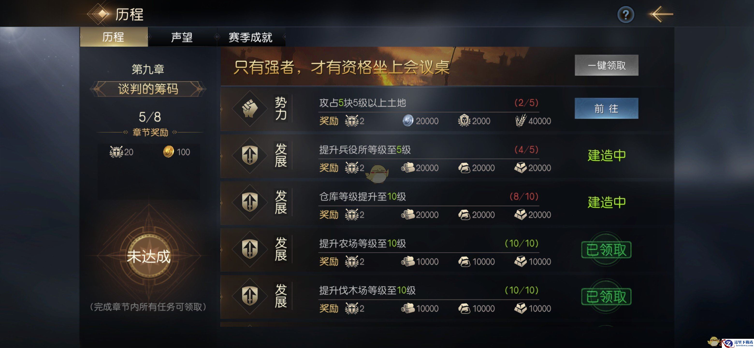 如果按照以上的大方向进行资源分配,那么你在前9个历程章节里完全不会被卡建筑资源,唯一有障碍的就是攻打5块5级地的任务,而打下5级地块的时候,其实你已经过渡到发展平台期了。