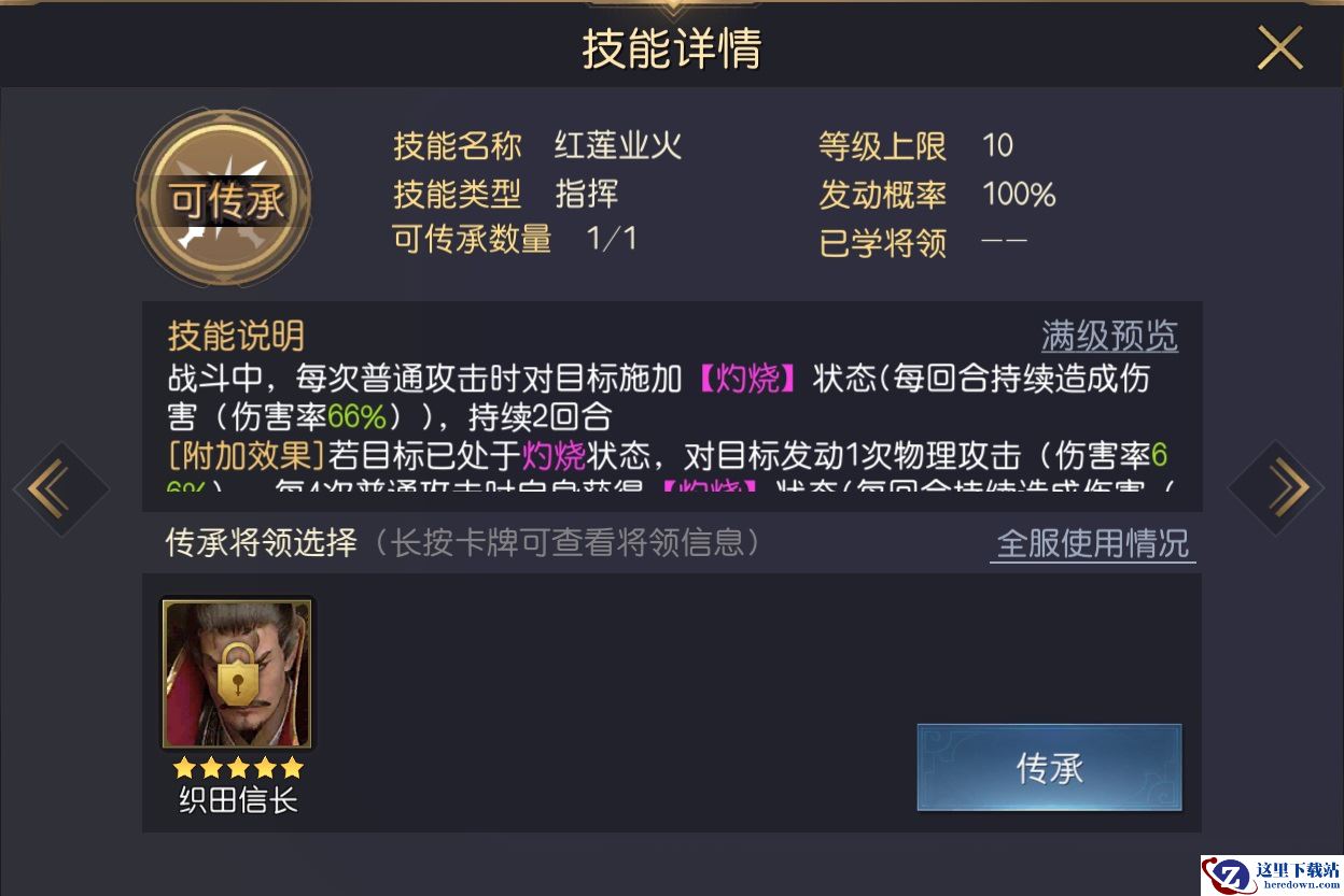 信长的一生,命中犯火。就像中国古代经历过多次兴佛灭佛一样,佛教常常因占用土地、社会劳动力等问题,与封建统治者产生矛盾,日本也不例外,这就有了信长的“火烧比睿山”事件。信长的归宿同样是火,本能寺之变中,信长于熊熊烈火中消失。“红莲业火”语出佛教,比喻烧尽罪恶之火。技能效果为,每次普通攻击对目标附加【灼烧】状态,持续2回合。如果敌人已经有此状态,那么对其发动1此物理攻击。需要注意的是,每4次普通攻击,自身也将获得【灼烧】状态,持续1回合。