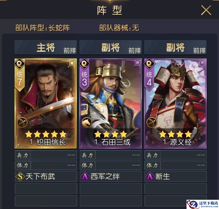 游戏后期,玩家橙色将领齐全的情况下,推荐队伍为“织田信长+酒井忠次+佐佐木小次郎”。