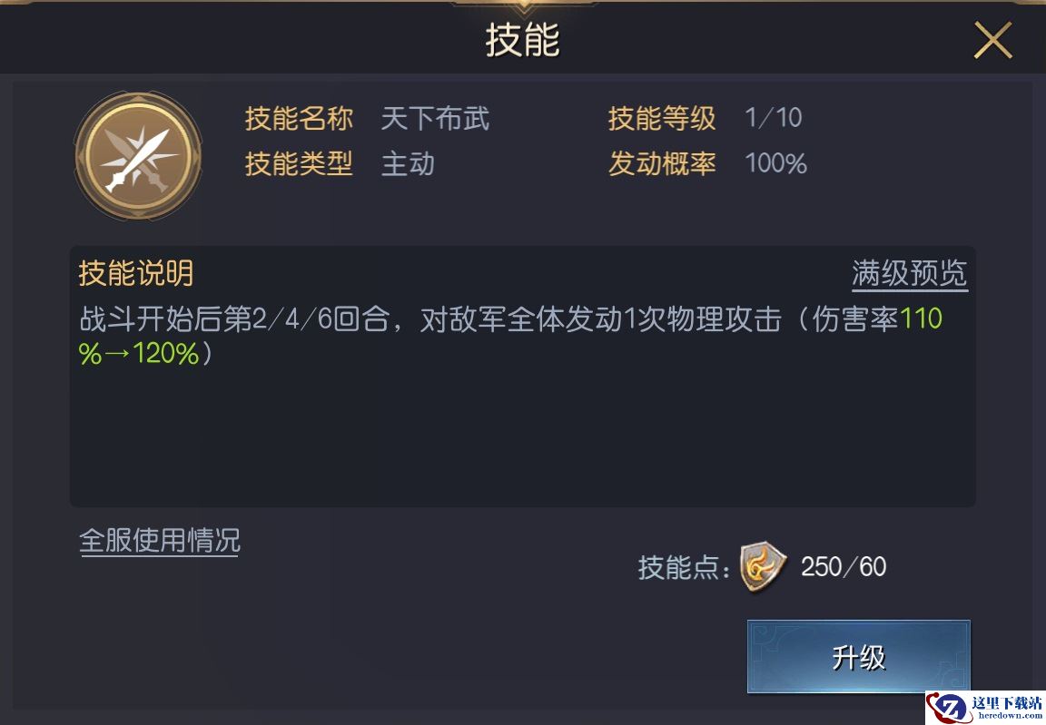 阿提拉的专属技能“上帝之鞭”,可以使自己与己方主将获得【群攻】状态,普通攻击时有50%几率攻击敌方群体,技能本身更偏辅助性质,优点是同时作用于2人。“天下布武”虽然隔1回合才能发动1次,但几率100%,伤害倍率极高,胜在稳定。
