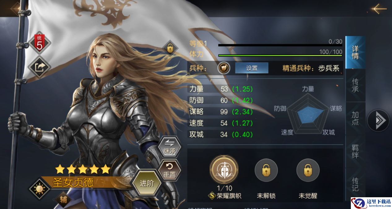 在所有阵容中,西洋阵容是包含辅助型武将最多的阵容。从自身属性上看,贞德与同阵容的同类武将相比,毫无优势。即便是基础属性值最高的“谋略”,也没有超过100。但贞德专属技能“荣耀旗帜”,弥补了贞德属性上的弱势,也使她成为了万金油型的辅助武将。