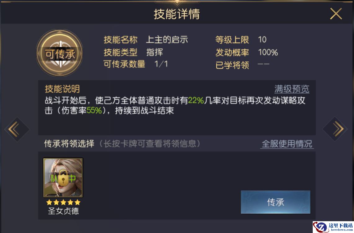 “上主的启示”,是贞德会成为天主教圣人,以及被后世称为“圣女贞德”的原因。正是由于圣女的身份,贞德统帅的法军,一直认为自己是在主的指示下战斗,正义在法军,因而很快扭转颓势,接连获得对英作战的胜利。不幸的是,贞德在被俘获后,被英国打上了“异端”和“女巫”的标签,十九岁便因火刑而牺牲。在游戏中,“上主的启示”成为了贞德的传承技能。效果为使己方全体在普通攻击后,有概率再次发动谋略攻击。