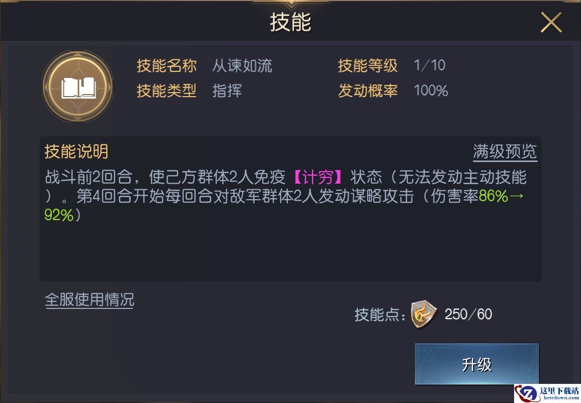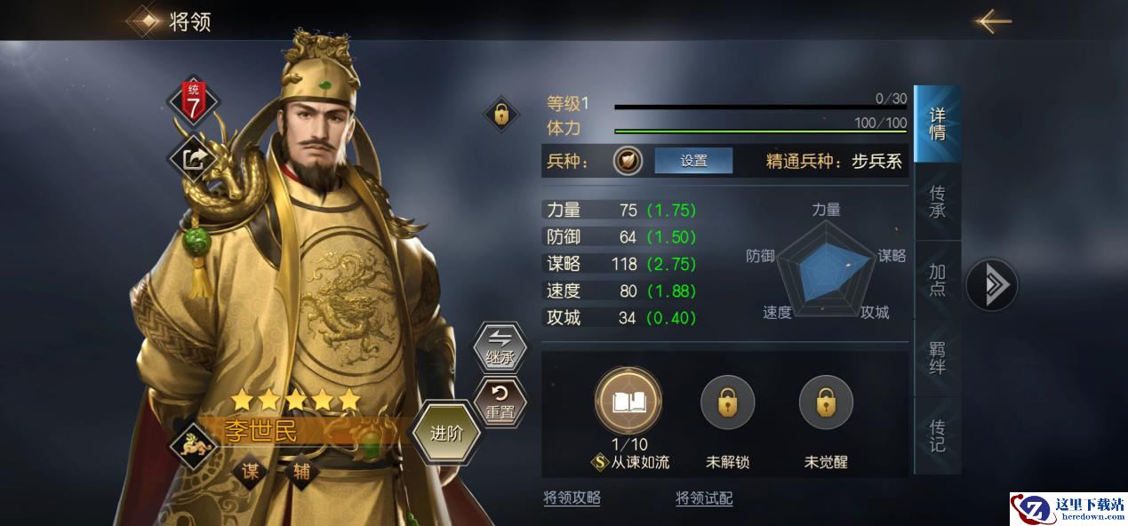 李世民最大的亮点在于输出和辅助融于一身,但要注意的是,专属技能“从谏如流”带来的辅助效果只作用于前2回合。2回合稳定的主动技能出手空间,让李世民成为主动技能将领的最佳拍档,在开局阶段足够强势。4回合后的稳定谋略输出,配上优秀的谋略成长,同样可以有上佳发挥。