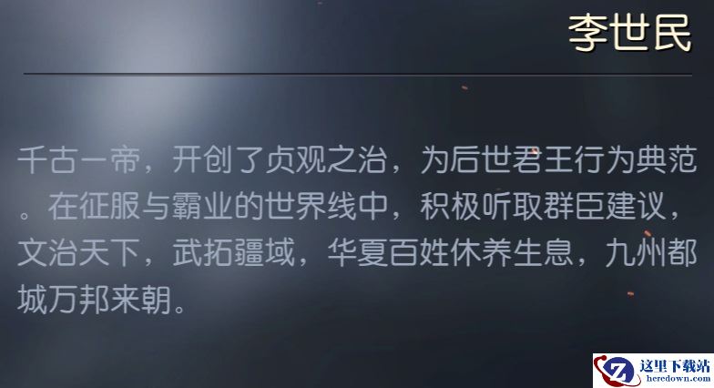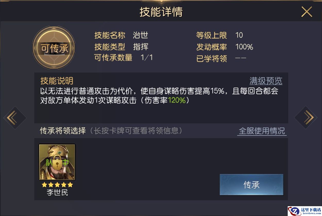 顾名思义,这一技能指代的就是李世民开创的“贞观之治”。李世民在位期间,对内从谏如流、休养生息,对外开疆拓土平地四方,更有着“天可汗”的尊称。正是在李世民的励精图治下,大唐才有了长达一百多年的盛世。而李世民,也是施行“王道”的千古名君。游戏中,“治世”为强力谋略输出技能,虽然牺牲了普通攻击,但进一步提高了谋略伤害,且每回合都会对1名敌人发动1次谋略攻击,相当稳定。