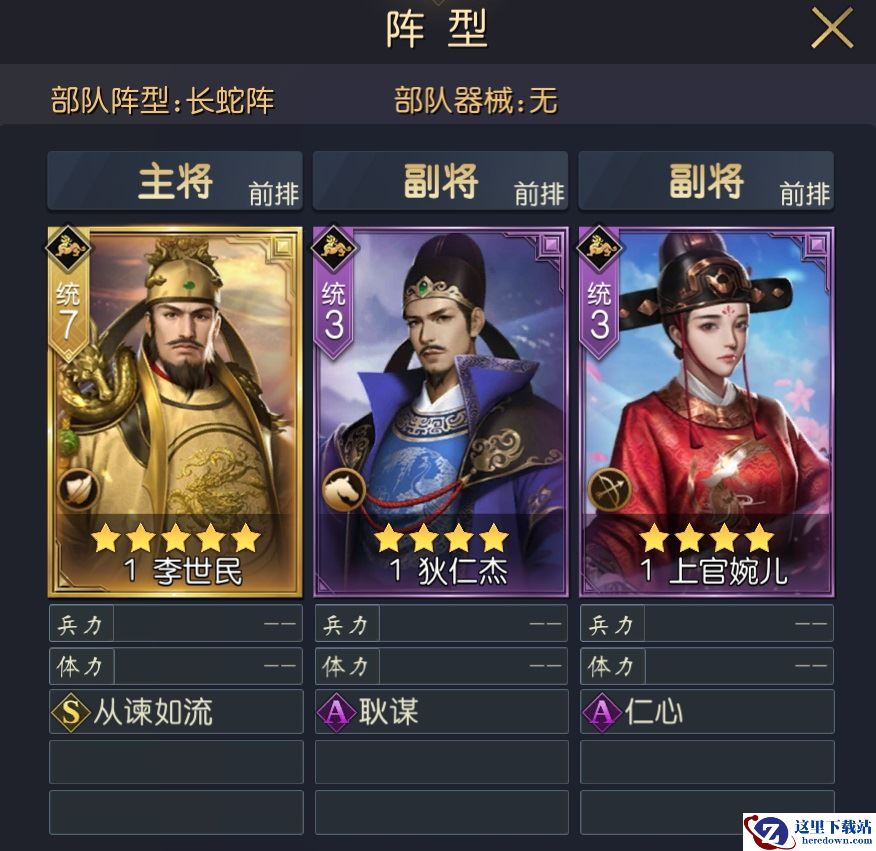 在前期阵容搭配上,李世民负责前排输出,需要搭配一名拥有治疗效果的将领,再补充一个谋略型将领即可。在玩家前期橙色将领不多的情况下,可以选择“李世民+狄仁杰+上官婉儿”。狄仁杰和上官婉儿自带技能都是主动技能,可以享受“从谏如流”的技能效果。上官婉儿是紫将中不错的医师,依靠技能“仁心”可以提供稳定的恢复效果。狄仁杰的技能“耿谋”是单体谋略攻击,亮点在于附加的【技穷】状态,可以有效限制敌方将领的主动技能。而且三名将领同属九州阵容,在玩家建造“九州崛起”建筑后,三名将领在战斗时,还能获得全属性10%的加成效果。