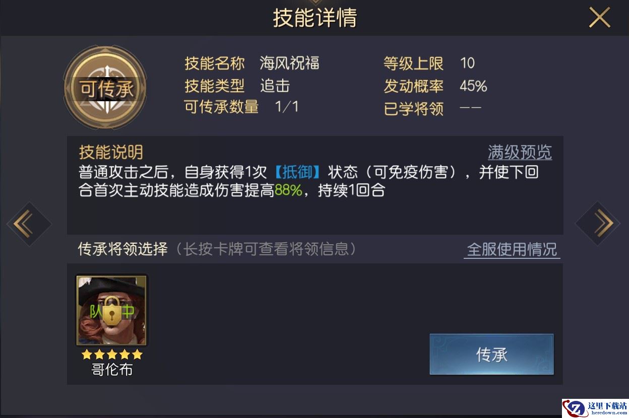 作为一名航海家,哥伦布一生中的多数时间,都是在海上度过的。四次远航,让他见识到了很多以往不曾想象过的奇景,也因此丰富了人类对于大洋生态的认知。比如发现和利用了大西洋低纬度吹东风,较高纬度吹西风的风向变化。证明了大地球形说的正确性。这一发现,也在《征服与霸业》中被设定为哥伦布的传承技能【海风祝福】。技能效果为,普通攻击后,自身获得一次【抵御】(免疫伤害),并且使下回合主动技能伤害提高88%(满级160%)。这是一项攻守兼备的技能,适用范围较广,配合哥伦布本身带有【连击】效果的主动技能【新大陆】,能组合出非常不错的输出表现。