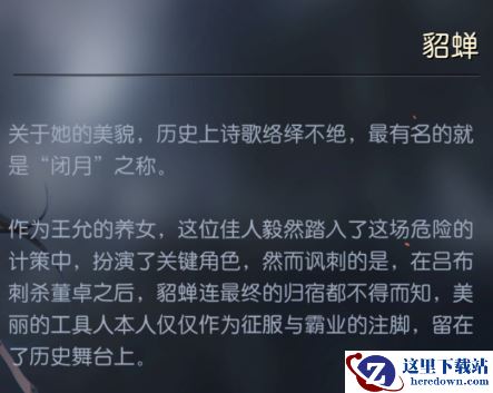 相传,貂蝉在王允的后花园拜月时,忽然有一阵清风吹来,一朵浮云遮蔽住了皎洁的明月。此后,王允逢人就夸自己的义女如何美貌,连月亮都害羞地躲在了云彩后面,貂蝉也就流传出了“闭月”的美名。游戏中,貂蝉的专属技能“闭月”,正是源自这个典故。效果是准备一回合后,优先对敌方一名智力最低的将领发动一次谋略攻击,并使其陷入“混乱”状态,攻击和技能不分敌我。值得一提的是,“闭月”的特殊效果是当敌方将领是吕布时,不分敌我的“混乱”会升级为“蛊惑”,使吕布必定攻击己方目标。