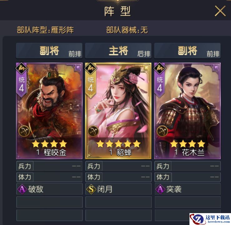 游戏后期,玩家橙色将领齐全的情况下,推荐队伍为“吕布+穆桂英+貂蝉”。