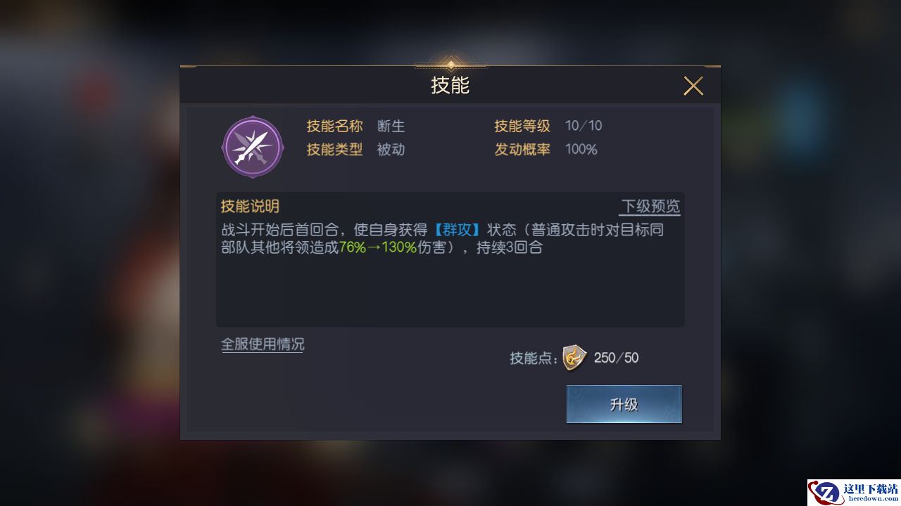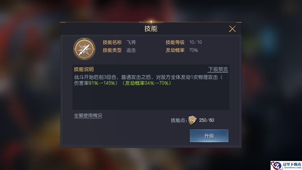 吕布的自带技能为【飞将】,属于追击型技能,初始发动概率为34%(满级70%),能够在前3回合中的普通攻击之后,对敌方全体发动1次物理攻击(初始伤害率91%,满级145%),这个技能具有非常强悍的AOE输出能力,回合开始便可以对敌人造成大量减员。