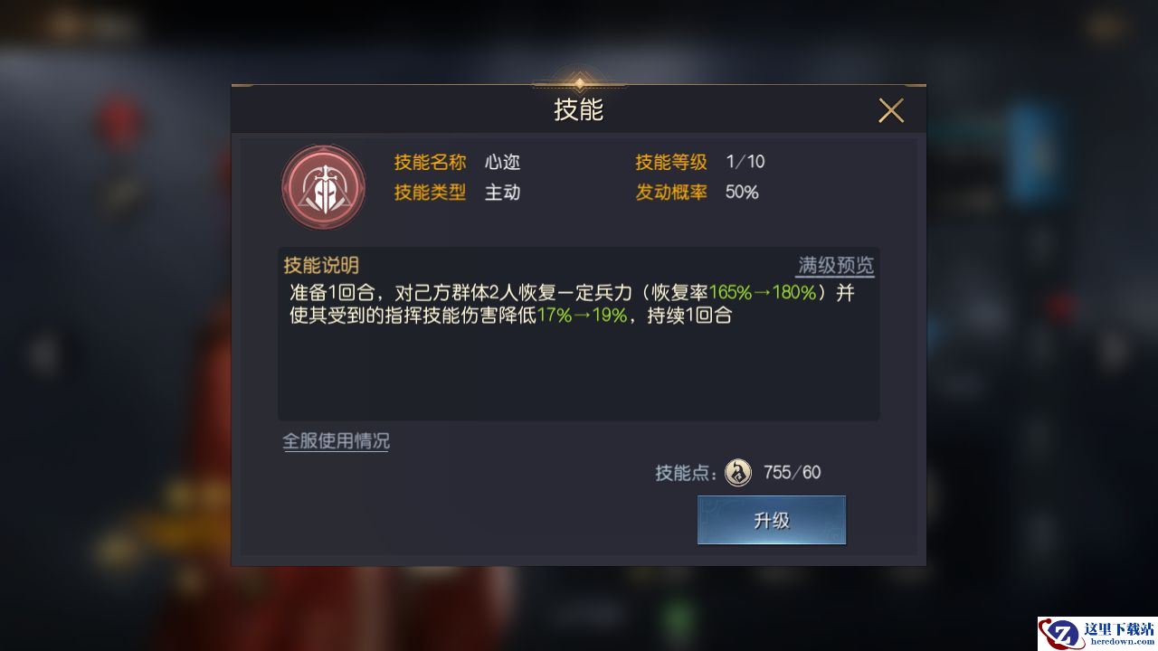阿市的自带技能为【心迩】,属于主动型技能,能够在战斗中以50%的概率发动,具体效果为:准备1回合,对己方群体两人恢复一定兵力(恢复率初始165%,满级300%),并使其受到指挥技能的伤害降低一定百分比(初始17%,满级35%),持续1回合。从技能我们可以看出,阿市能走的路线只有两条,一是2、3技能带辅助,配合1技能打团队增益,二是2、3技能带恢复,走纯奶妈路线。