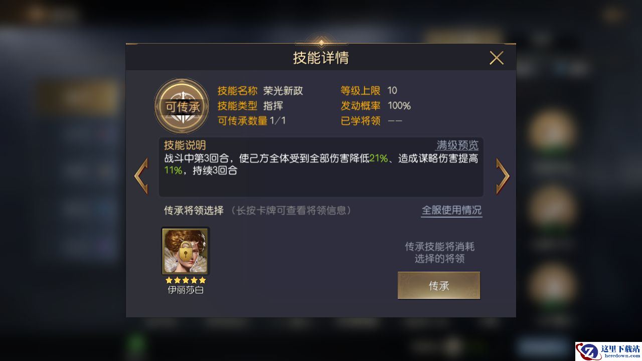 考虑到阿市属于辅助型将领和医师型将领,所以建议在为其搭配二三技能的时候选择辅助型技能,提升阿市的辅助能力,这里推荐【荣光新政】、【浮叶】等。其中,【荣光新政】能够在第3到6回合使己方全体受到的伤害降低一定百分比(初始21%,满级30%)且造成的谋略伤害提高一定百分比(初始11%,满级20%),能够大幅度减少己方队伍受到的伤害,且非常适合于搭配谋略将领的情况;【浮叶】能够在战斗开始的前4回合以50%的概率对己方群体2人恢复兵力(恢复率初始150%,满级240%)并驱散【灼烧】【中毒】状态,且在恢复目标兵力大于80%时,获得1次【抵御】状态,此技能能够大大提升阿市的兵力恢复能力,且能够为队伍带来一定的解控效果。这类技能能够大幅度增强辅助(包括恢复兵力)能力,非常适合于阿市。