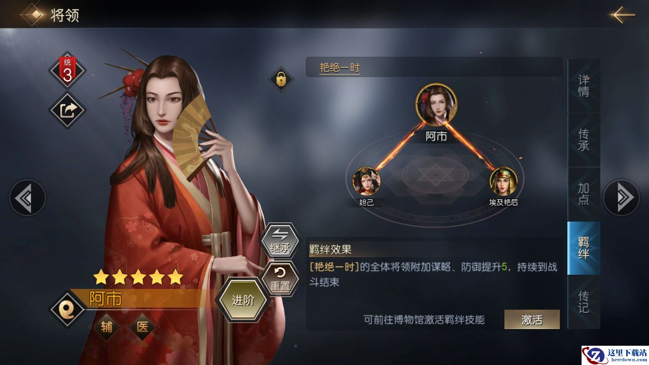 阿市的羁绊为:阿市+妲己+埃及艳后,当用户集齐这三个将领时可激活【艳绝一时】羁绊效果,即使己方全体的谋略、防御属性提升5。这个效果对于此羁绊阵容来说是非常实用的,例如在【阿市+妲己+埃及艳后】情况下,妲己和埃及艳后均为谋略输出型将领,在羁绊效果的加成下能够有更高的扛伤能力和输出能力。