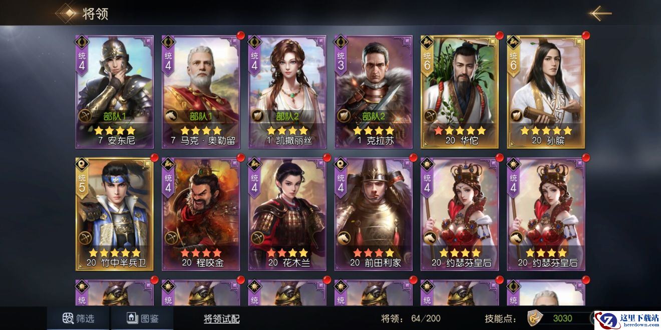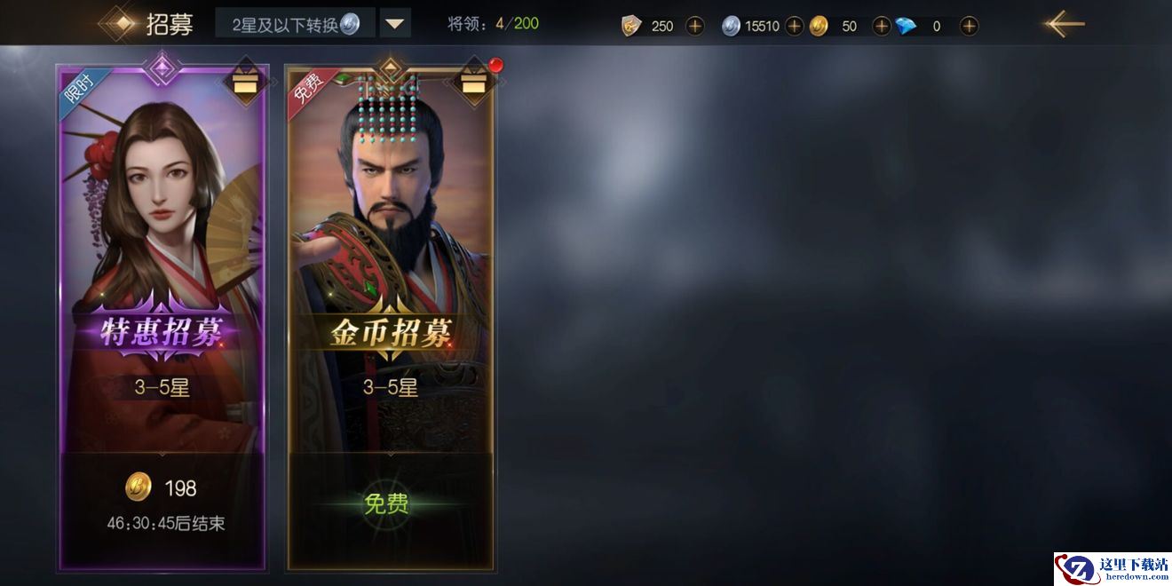 在该界面,可消耗金币和银币选择对应的卡包进行招募,招募获得的将领分为九州,东瀛、西洋和古典四个阵营。