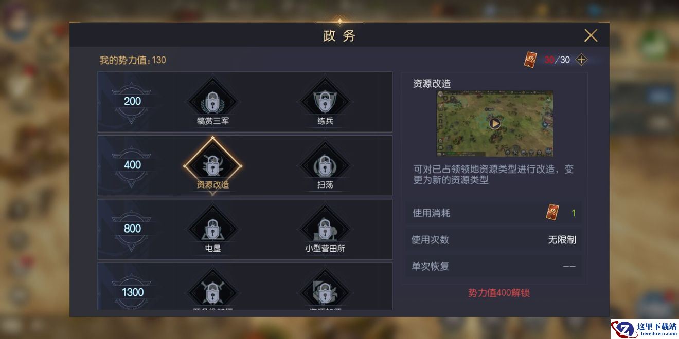 对于已占领的沙盘,可以使用【驻防】功能,选择部队后生效,可自动防御周围1格范围内的己方土地;【建造】功能可以在已占资源点上建造建筑,有功能类,有防御类的,也有资源类的,需要在城建系统中相应解锁。相对于未攻占沙盘,增加了一个【放弃领地】的功能,在领地余数不足的情况下,可以适当放弃低等级的领地。