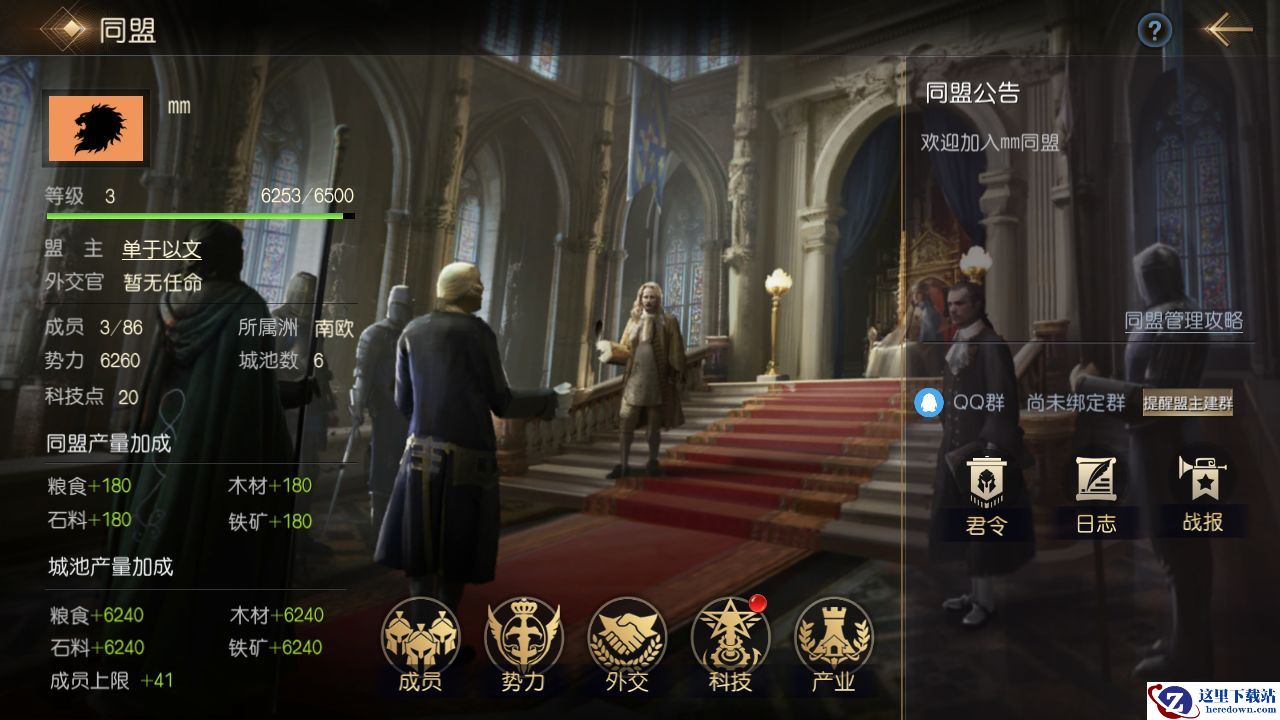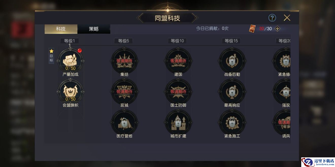同盟科技随着同盟等级提升逐一开启。科技开启后可解锁对应效果及同盟策略。同盟策略在GVG中起到非常重要的作用。通过成员资源捐献的方式提升科技等级。个人势力值不同,每日单次捐献资源量不同,势力值越高单次捐献量越大。每日前10次捐献,每次捐献个人政令+1,同盟科技点+1。每日捐献10次后再次捐献将无法获得贡献度,政令,科技点,同时捐献科技及同盟经验获取按原效率1/100转化。