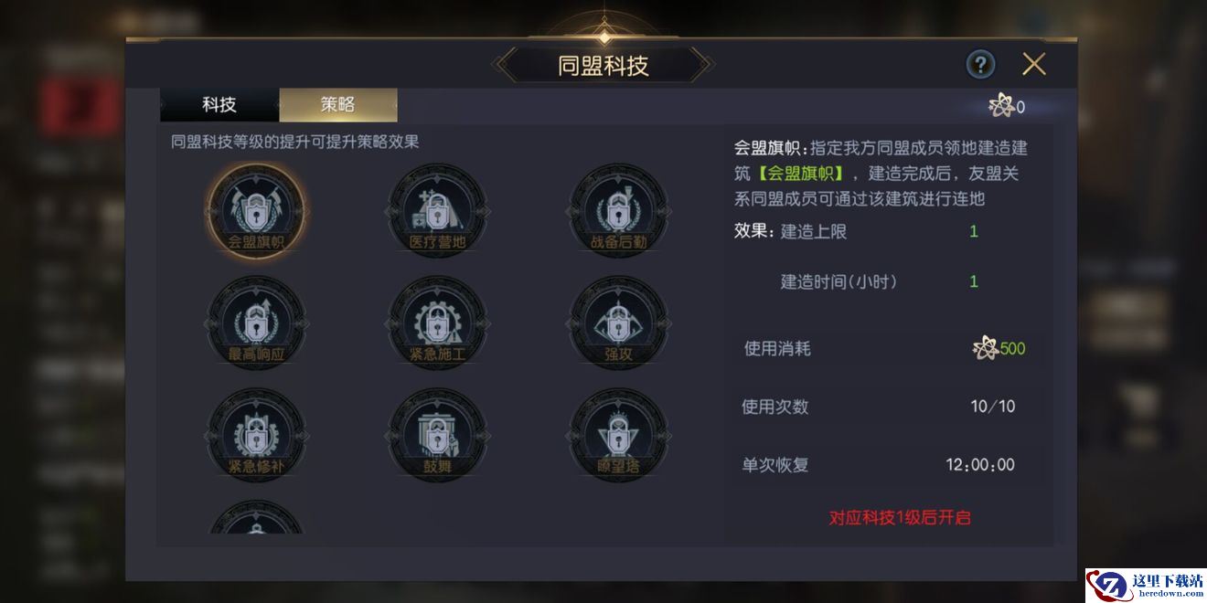 同盟策略的开启需解锁对应同盟科技,盟主,副盟主级指挥官才可使用策略。策略使用需要消耗科技点,科技点通过成员捐献获得。