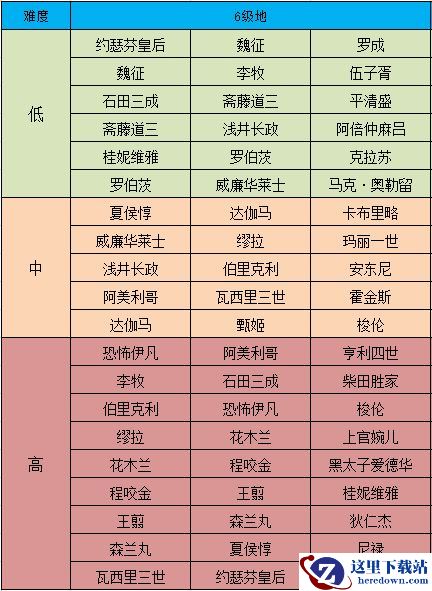 在应对技巧方面,我们可以根据侦察到的信息,去衡量两队守军的强度孰强孰弱。可以选择去克制两支守军中强度较大的一支,这样才能尽可能的减小损失。献上本次版本六级地难度表,君主们可以参考难度制定战略目标: