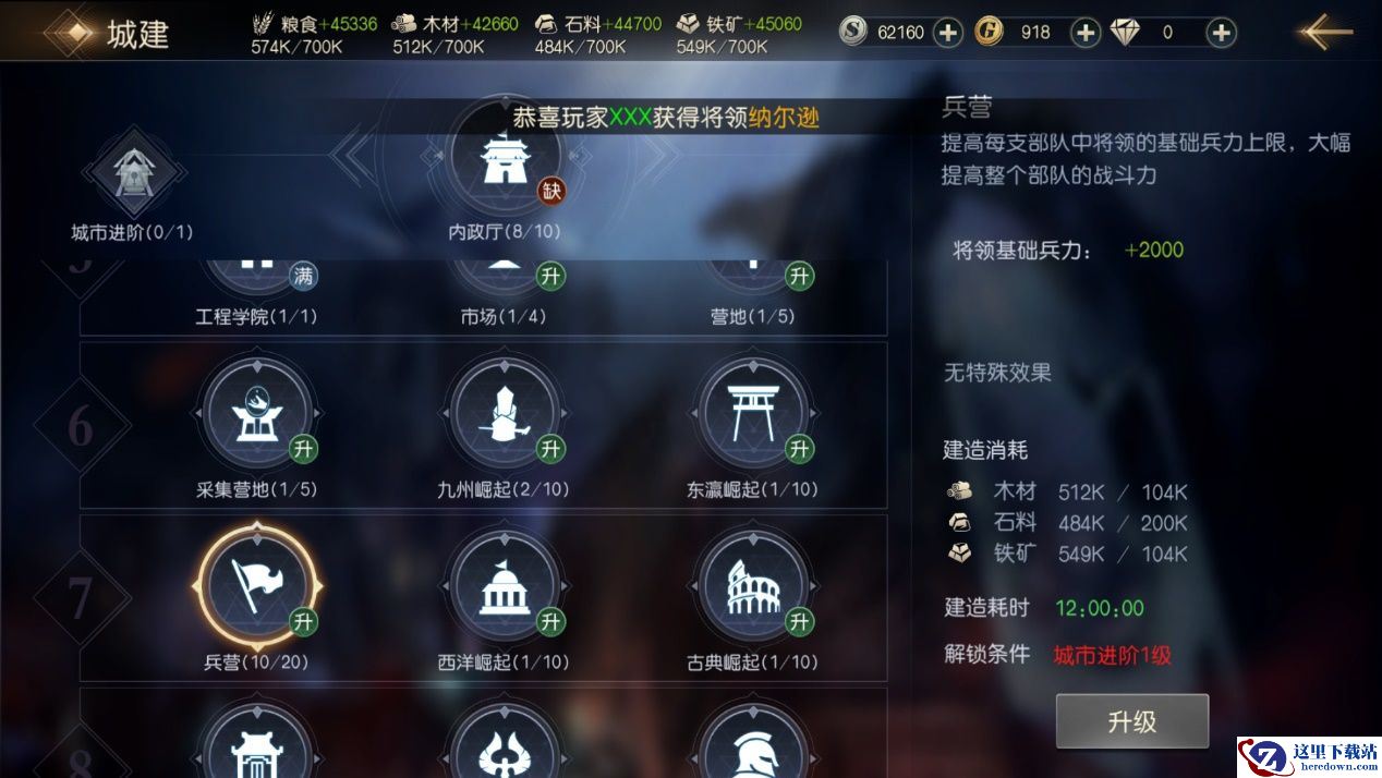 想要开六级地,单纯的依靠武将等级和技能上的提升可能比较拖节奏了,所以我在这里提醒大家另外一点,那就是在我们开六级地之前,最好已经把内政厅升到了7级,同时将兵营的等级升到5级左右,兵营能够提高将领的带兵上限,提高部队造成的伤害和容错率。最好也升几级主力部队所对应的势力崛起城建等级,进一步提高将领属性。