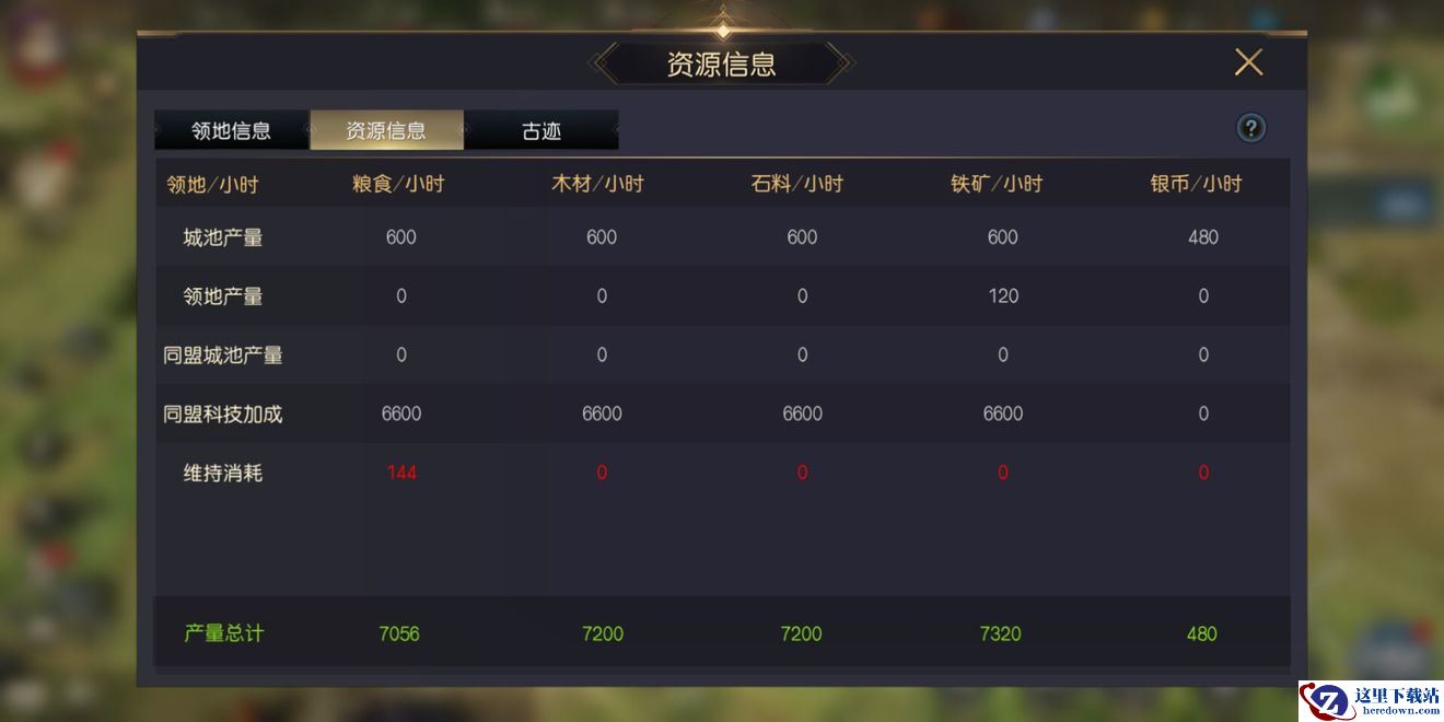 1、基本维持消耗。所有在主城内的部队及预备役所产生的粮食消耗,每10000预备役每小时消耗480粮食。可点击游戏主界面的资源栏,在弹出的资源信息界面中点击“资源信息”页签,在维持消耗栏可查看当前的粮食消耗量。