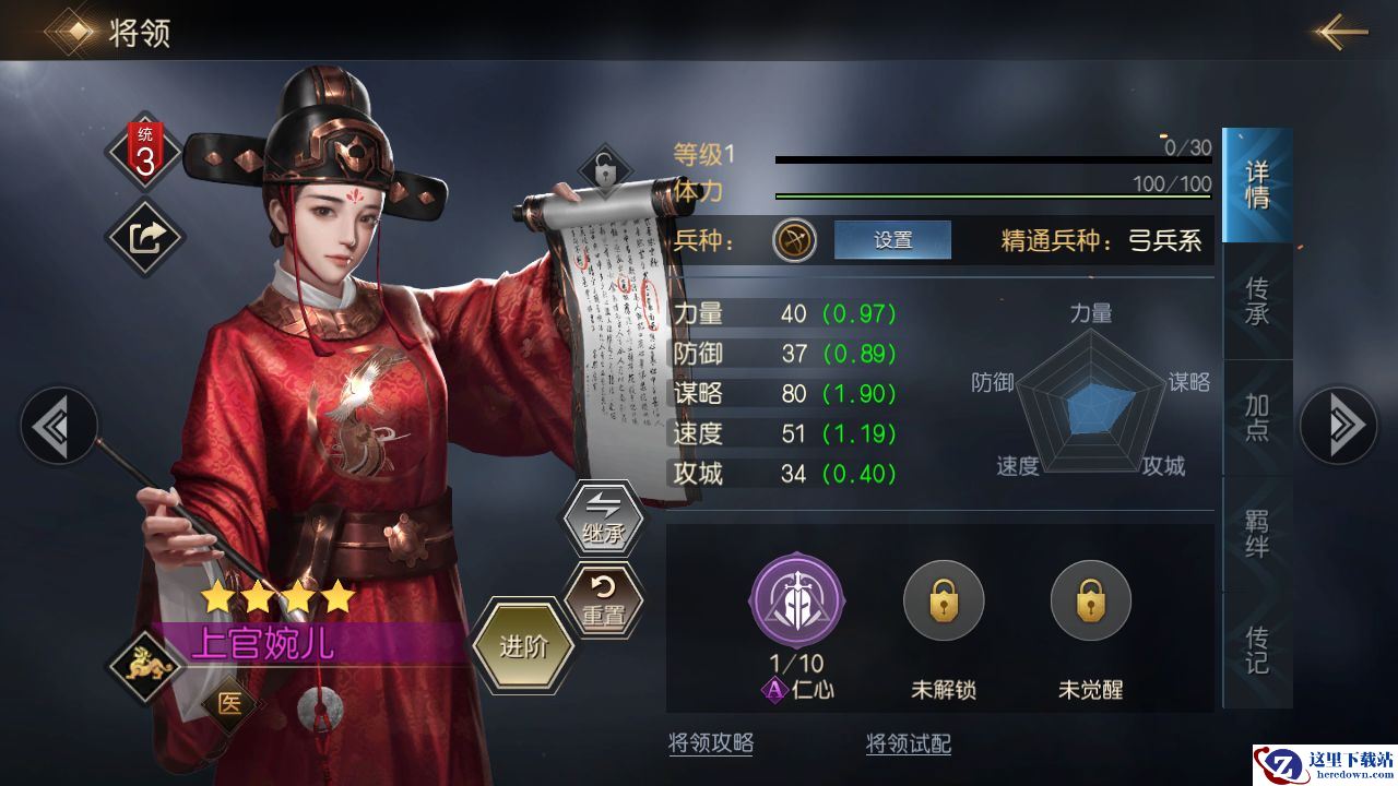 上官婉拥有强大的治疗能力,其自带技能可以在前4回合对己方兵力最少的将领进行治疗,增加了队伍的生存能力。技能搭配上我推荐【止殇】+【激励】,增加谋略输出的同时也进一步略微强化了恢复能力。