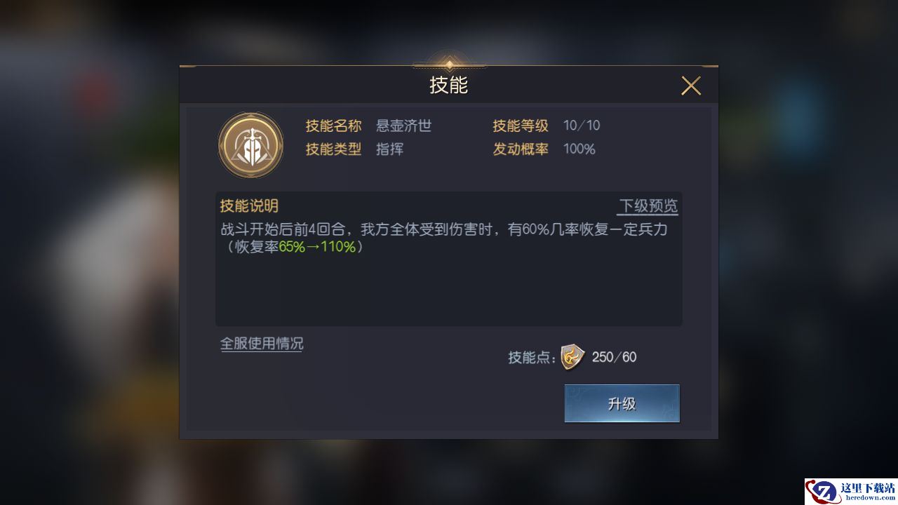 华佗的自带技能为【悬壶济世】,属于指挥型技能,触发概率为100%,在战斗开始的前4回合,我方全体受到伤害时,有60%的几率恢复66%~110%兵力。这个技能的优势在于效果涵盖前4回合,恢复对象为己方全体,覆盖面广,可兼顾兵力高和兵力低的将领(许多技能只针对兵力最低将领进行恢复,或是随机选择对象),这种全面的恢复效果非常适合于开荒时降低兵损,这也是在开荒队伍中强烈推荐将华佗作为辅助的原因。