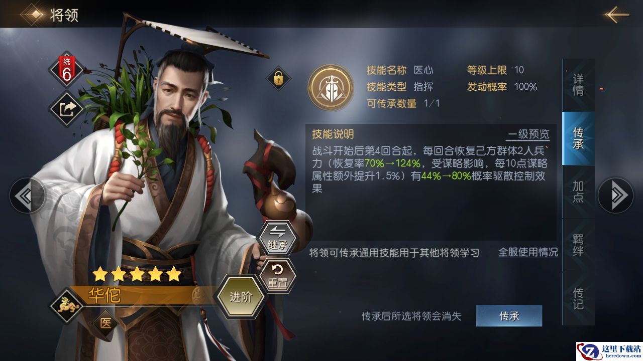 虽然华佗的【悬壶济世】发动概率高、治疗范围广,但缺点在于技能的兵力恢复率较低,尤其是在技能等级低的时候。为了进一步降低开荒战损,建议强化华佗的治疗能力,所以比较推荐的二三技能是【仁心】、【医心】等。其中【仁心】能够提高华佗在前4回合的治疗能力,而【医心】则能够使得华佗的技能在4回合后同样具有治疗效果,治疗效果受谋略属性额外加成,且【医心】还能够为队伍带来一定概率的解控效果,有利于稳定队伍在开荒时的输出。
