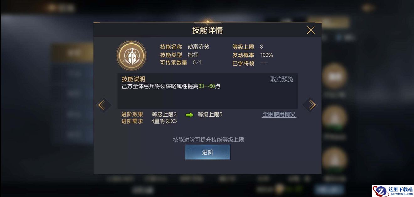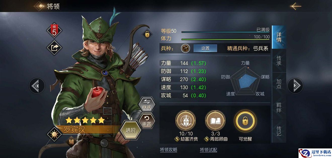 罗宾汉的自带技能【劫富济贫】,技能效果为:提升己方全体弓兵将领谋略属性33点,满级提高60点。这是一个全体增幅技能,高达60点的谋略属性加成,非常适合一些打谋略数值差的弓兵将领。