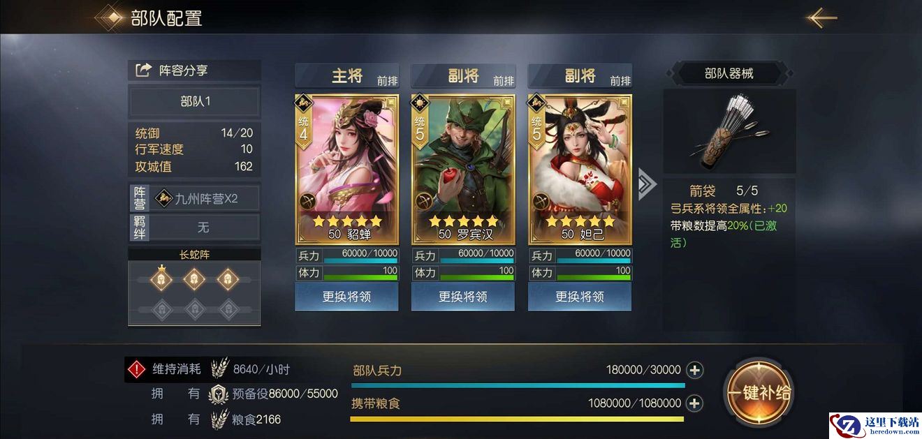 【貂蝉+罗宾汉+妲己】,这三个将领都为弓兵,所以在【劫富济贫】的增益下,都有高额的谋略属性加成,再搭配上貂蝉的控制型技能【闭月】,技能效果为:准备1回合,对敌方单体(优先智力最低)发动1次伤害率170%,满级350%的谋略攻击,并使其陷入【混乱】状态(攻击和技能无差别选择目标),持续2回合,附加效果:若目标将领为吕布时,使其陷入【蛊惑】状态(普通攻击和技能攻击必定选择己方目标),持续2回合;以及妲己的AOE技能【红颜祸水】,技能效果为:对敌方群体2人发动1次伤害率99%,满级180%的谋略攻击(受双方谋略之差影响,每10点谋略属性额外提升1.5%),使得阵容在伤害,控制等方面表现都十分优异。