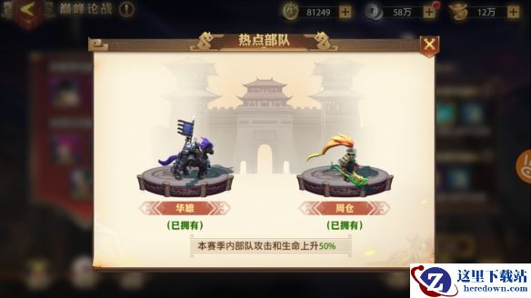热点部队每个段位和每个赛季都会不一样,举例来说,本赛季的热点部队是华雄和周仓,高端局中因为华雄适合与残暴流做搭配,因此在高端局中我们经常能看到华雄的上阵。周仓可以触发的破甲流以及黄巾流不太适合高端局,因此大家基本不用。能用热点部队的主将尽可能使用,但是也要考虑这名主将所搭配的阵容是否适合打高端局。