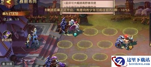 1、赵云、孟获放在第一排扛伤害和迅速冲击战场。刘备放在第二排紧挨着近战部队享受攻击加成。祝融放在最后一排使得输出最大化。马云禄和曹冲两轻骑哪路没人放哪路,一般上下两路。