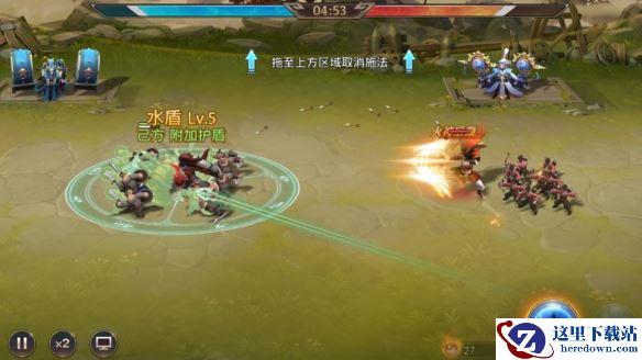 通关方法:默认布阵开局,当祝融身上光圈亮起后,立即释放“水盾”,挡住“火神后裔”,然后立即使用“活血术”给小兵回血,就能通关。