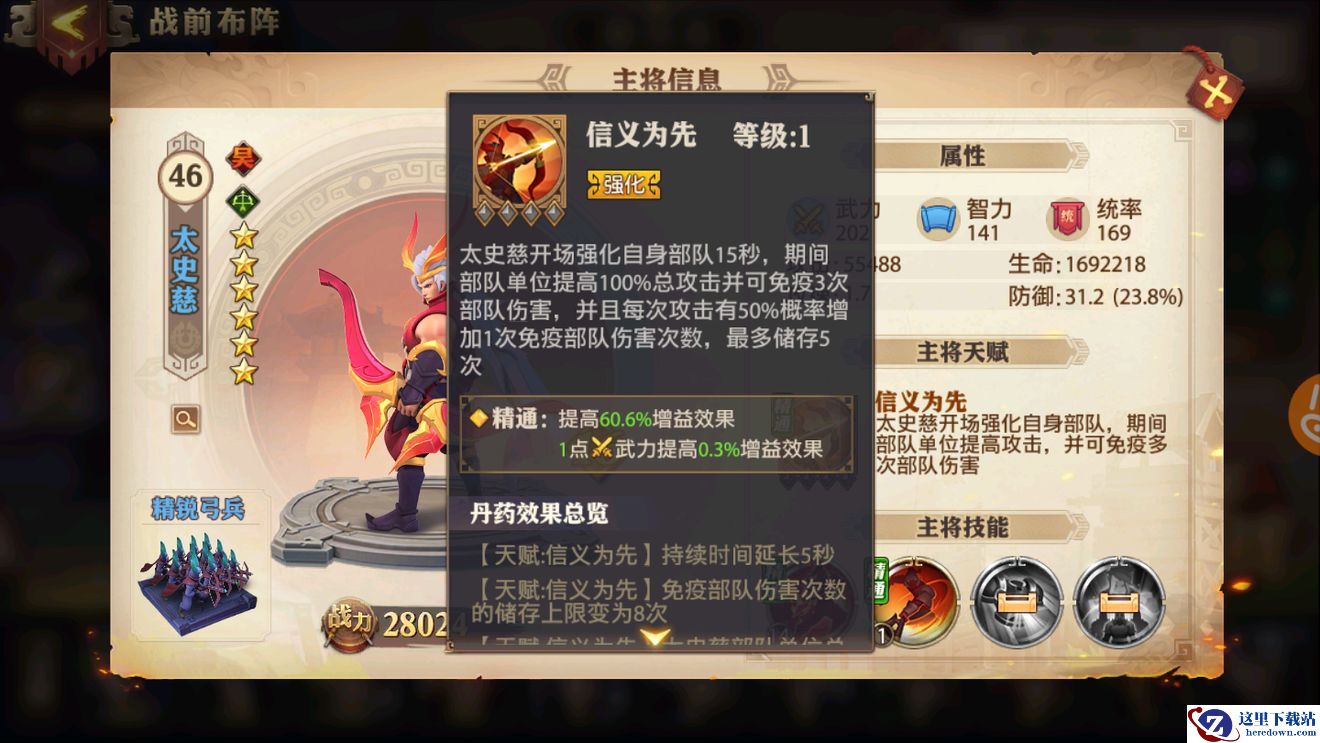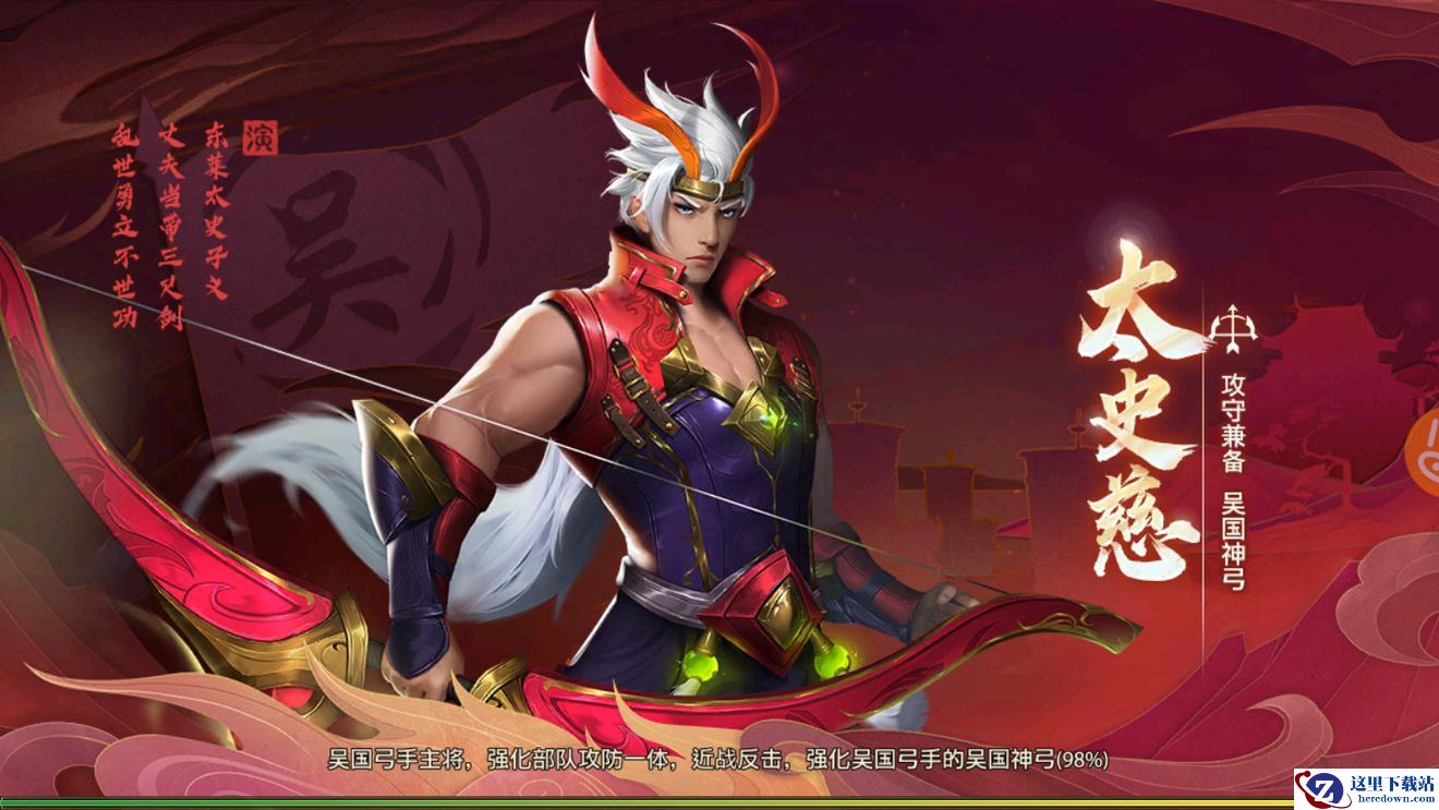在阵容上,这边选择了四吴国弓手作为后排输出,其中最重要的弓手主将就是太史慈,因为它拥有特殊的技能机制,能在对面轻骑或者重骑切入到后排的时候,通过天赋技能信义为先的免疫伤害效果当成一个短暂的承伤角色,再加上其拥有的还击技能,能够提供稳定的控制能力,让他成为了当前版本的最难被对方处理的弓手。