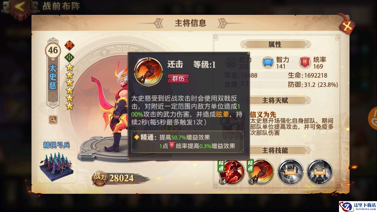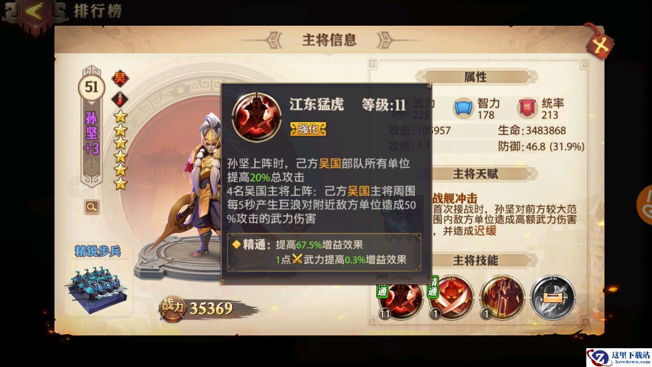 另一个是核心的江东猛虎技能,孙坚上场之后,将会对在场的所有吴国部队单位提升20%的总攻击力,对于整个阵容的强度提升极大,再加上每5秒一次的50%攻击的武力伤害,毫无疑问让整体的输出被进一步拔高。