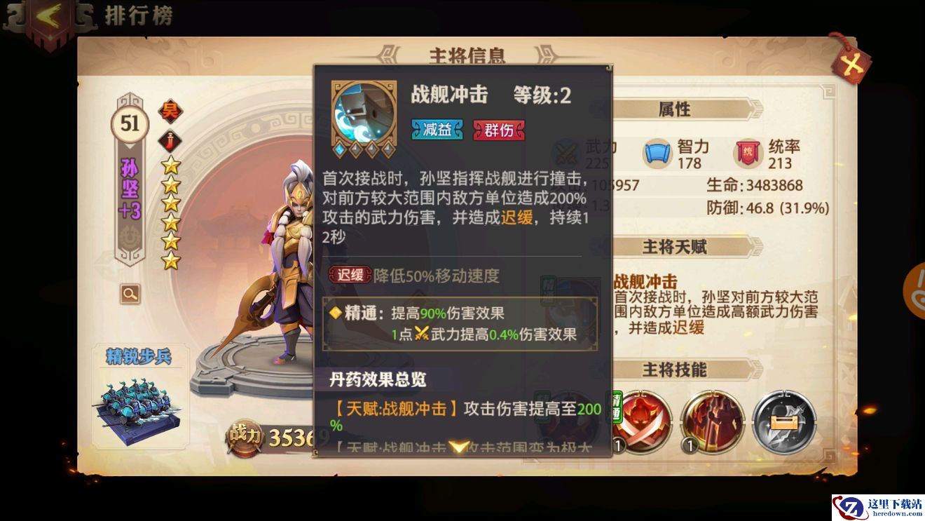 想要进一步极限化吴国弓手的输出,整个阵容最重要的角色其实是孙坚,孙坚在整体阵容中起到了两大作用,一个是天赋战舰冲击所造成长达12秒迟缓效果,吴国弓手在攻击迟缓角色的时候会增加暴击,并且迟缓能有效地减少对面冲击后排的速度。