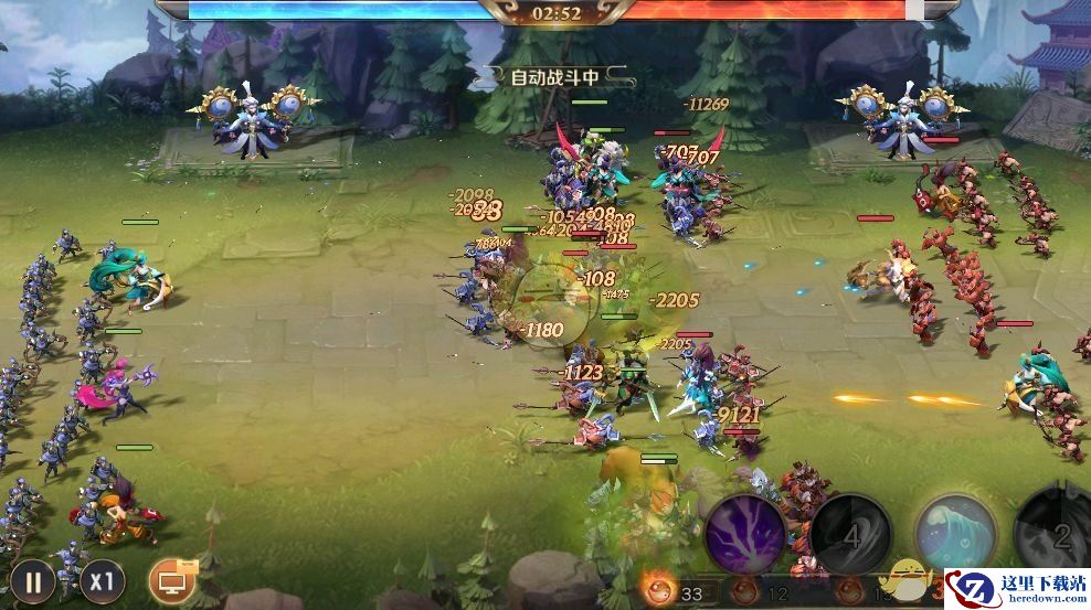 2、竞技场战斗为自动战斗,左下角的暂停键点击之后可以呼叫出菜单进行特效上、音效上的设定,调整战斗速度的按键也同样在左下角,上方的红、蓝色血条可以展示双方当前的实力对比,可以更加容易的洞悉场上的形式