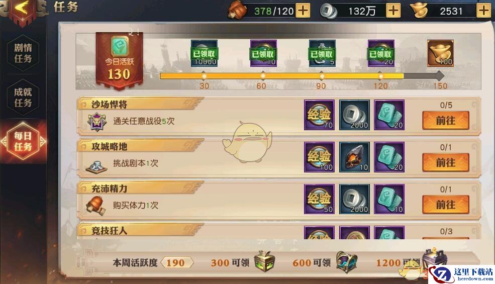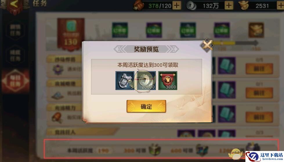 日常任务的奖励主要为银两与经验,部分任务拥有竞技币、军功赠送。达到一定的活跃度可以赠送额外的资源。其中在满足120活跃度时获得的功勋是重要的资源,可以提升自身的爵位来获得非常多的加成。
