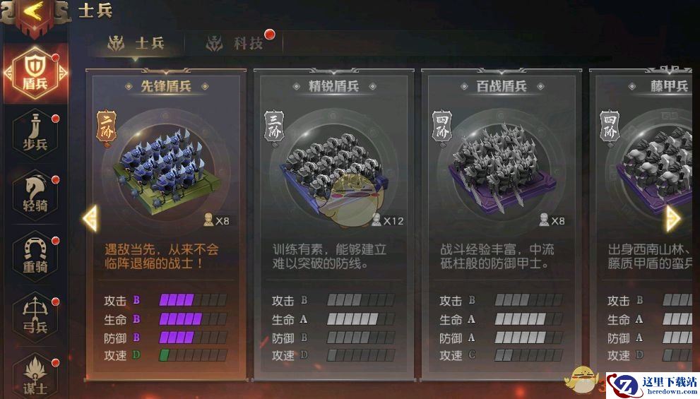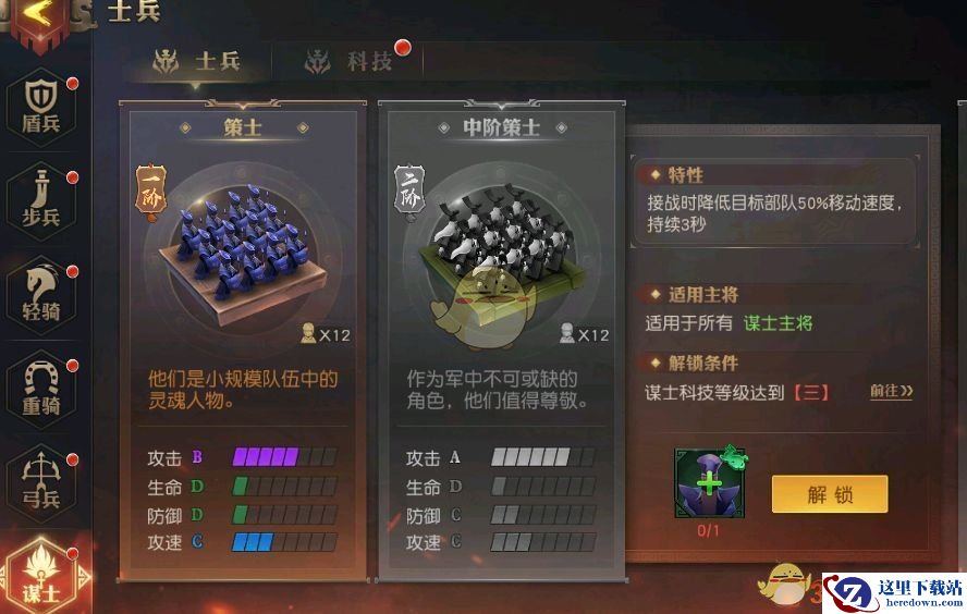 2、在解锁新的训练阶段之后,可以在图鉴中查看各类即将解锁、已经解锁士兵的属性。点击士兵对应的特性按钮时可以看到该类士兵所拥有的特有属性。
