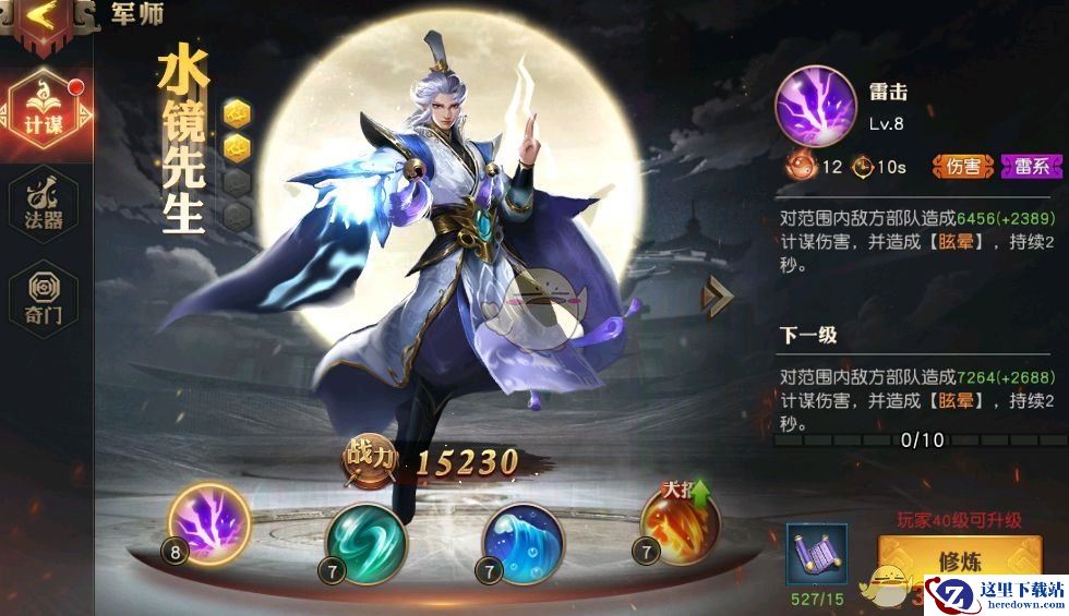 与武将的养成不同,军师的养成主要为计谋、法器、奇门3个方面,每位军师的计谋、法器与奇门都不相同,请灵活的使用不同军师哦。