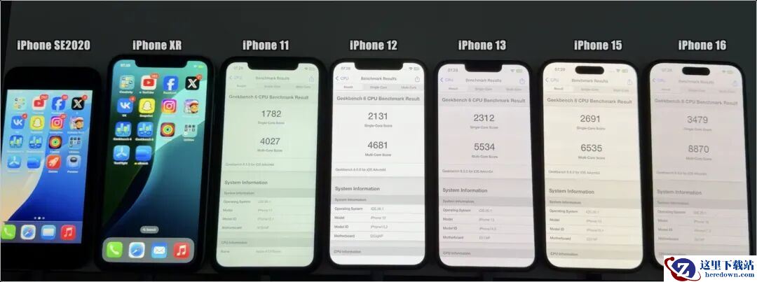 本次测试一共使用7款 iPhone,分别为 iPhone SE2 / XR / 11 / 12 / 13 / 15 / 16,包含了 A12 ~ A18 的芯片