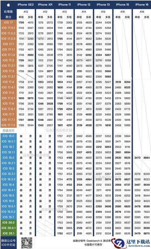 在本次测试中,iPhone XR 升级到 iOS18.7.2,其它 6 款升级到 iOS26.1