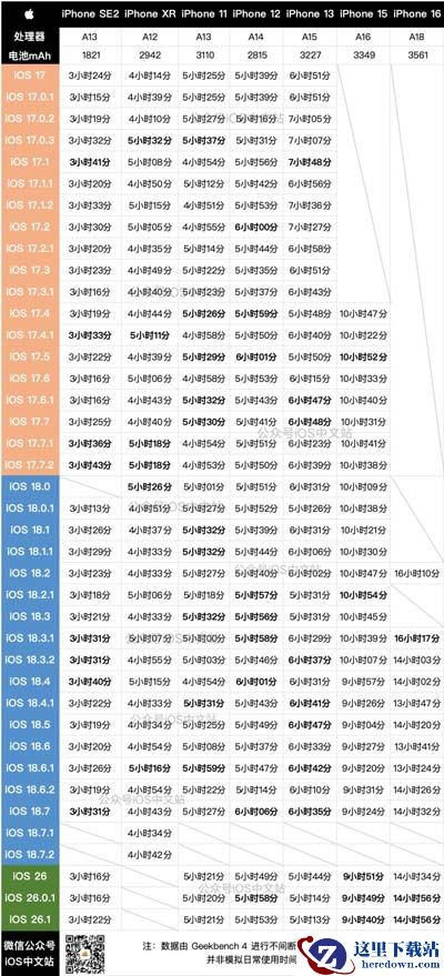 上方是 iOS17所有版本、iOS18所有版本、到目前 iOS26 的续航实测时间,大家自行对比。注意:要考虑电池健康度逐渐下降的问题,所以对比相近的版本比较合理