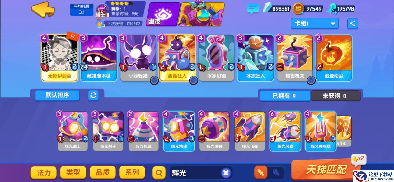 在新资料片“铭刻”中,“幽夜”阵容增加了全新的“辉光”字段卡牌,因此,全新的“辉光流”套路应运而生。带有“辉光”字段的卡牌,都与英雄施放法术有关。“辉光”字段的随从卡,自带关键词“共鸣”,效果为我方每使用一次法术,随从的攻击力和生命值都会增加一点。一个随从一共可以共鸣三次。“辉光”字段的法术,统一带有“位于手牌时,释放一次法术后,费用减一”的效果。