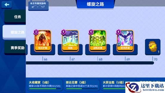 1、螺旋之路是玩家的收集奖励的主要玩法之一,完成螺旋之路的任务可获取大量卡牌并解锁英雄。