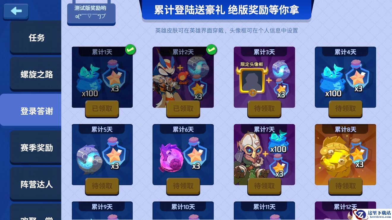 本次登录答谢活动我们为大家精心准备了21天答谢礼物哦,测试期间登录满相应天数,即可领取小鱼干、橙卡、限定头像框、英雄皮肤等豪华奖励。