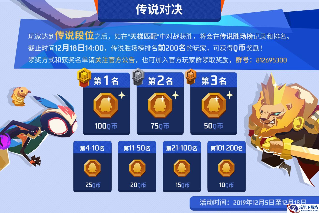 12月4日将会结算第一赛季奖励,从12月5日开始第二赛季,玩家达到传说段位之后,如在“天梯匹配”中对战获胜,将会在传说胜场榜记录和排名。截止时间12月18日14:00,传说胜场榜排名前200名的玩家,可获得Q币奖励!