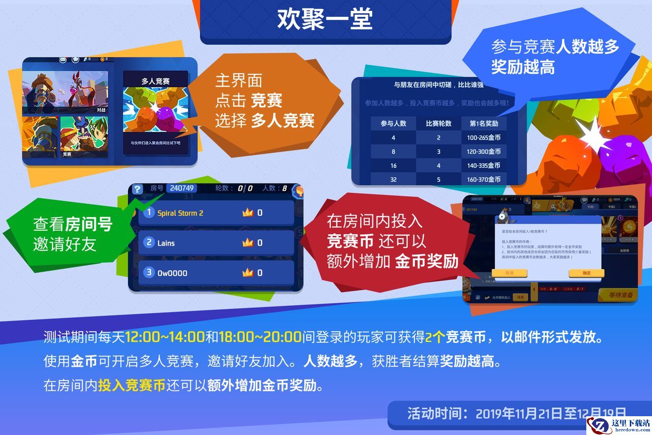 测试期间,每天12:00-14:00和18:00-20:00间登录的玩家,可获得2个竞赛币。使用金币可开启多人竞赛,可邀请朋友加入,人数越多,获胜者结算奖励越高,另外在房间内投入竞赛币还可以额外增加金币奖励。