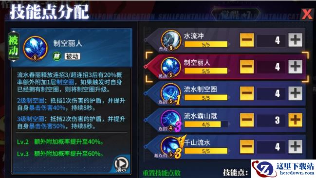加点分析:流水春丽的技能主要在于被动效果制空圈的作用,制空圈不仅可以提升流水春丽的暴击伤害,还能抵挡伤害,建议主加;而超连招3作为主要输出技能,配合制空圈的效果可以造成更高的伤害,值得副加。