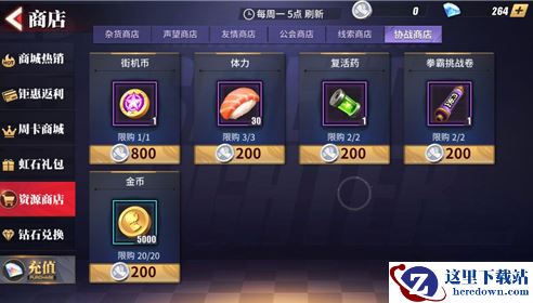 打开商店,选择资源商店,里面出售体力、复活药金币等物品,花费200协助积分可以获得30点体力。每天限购3次。